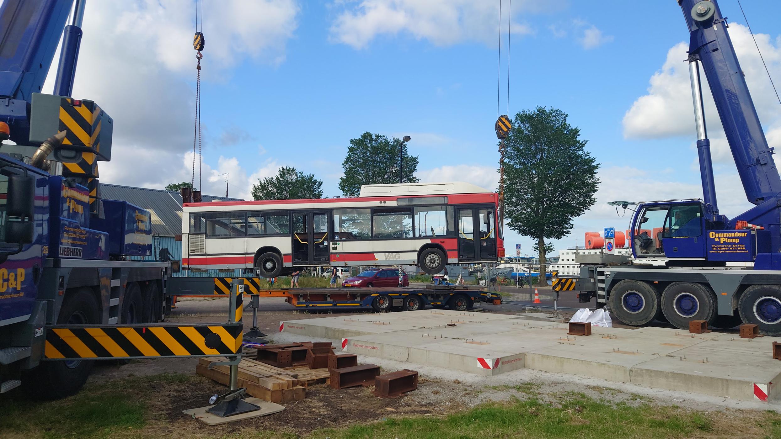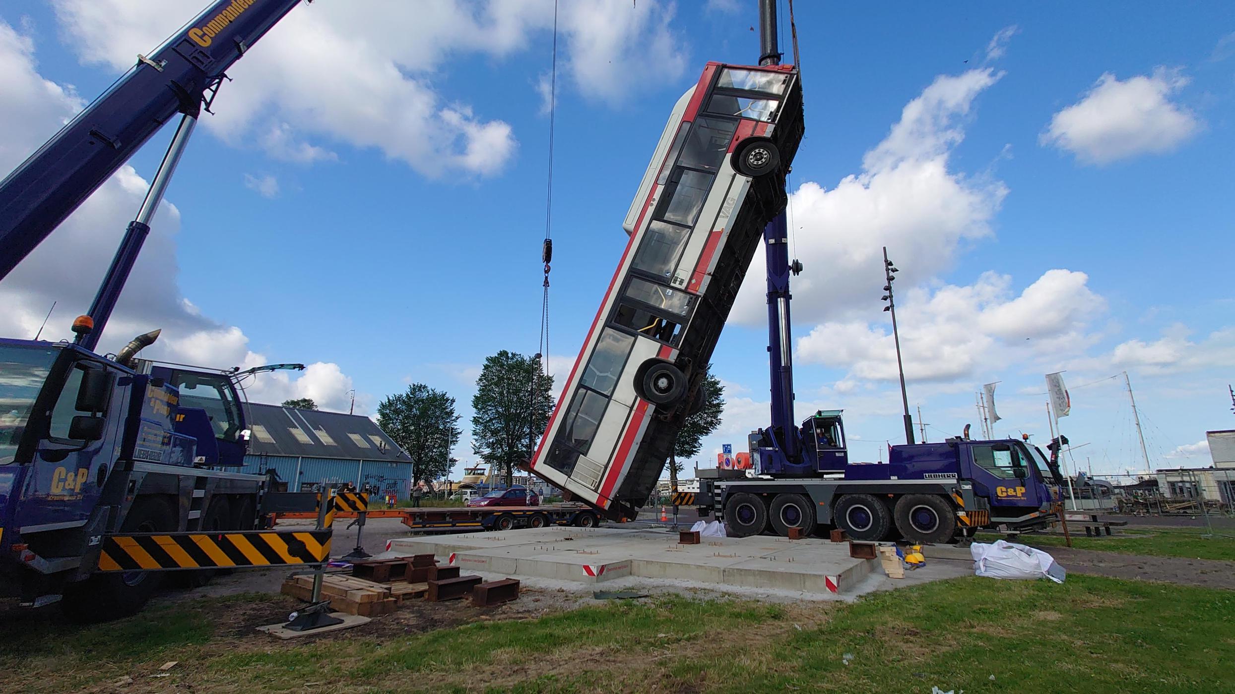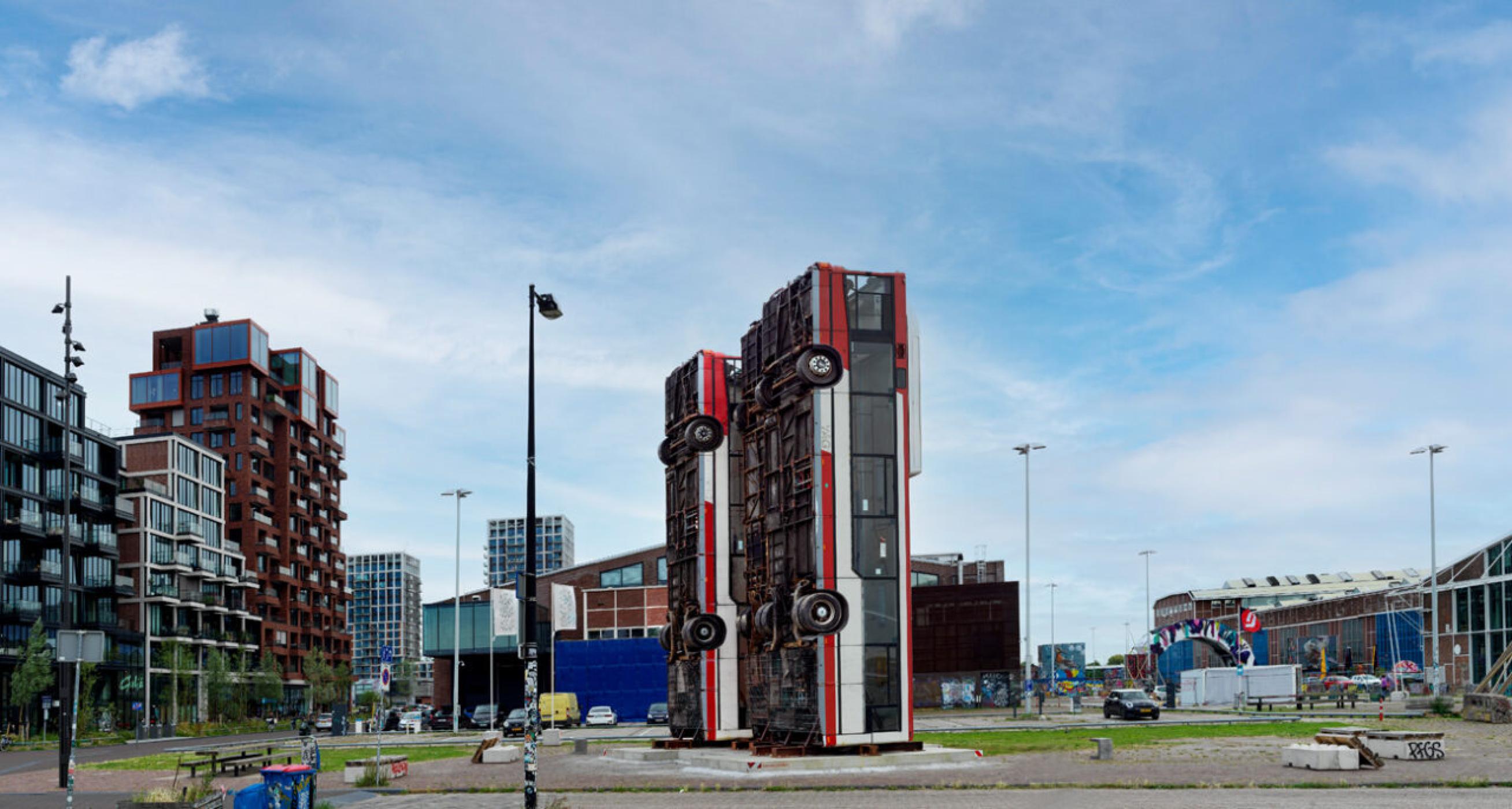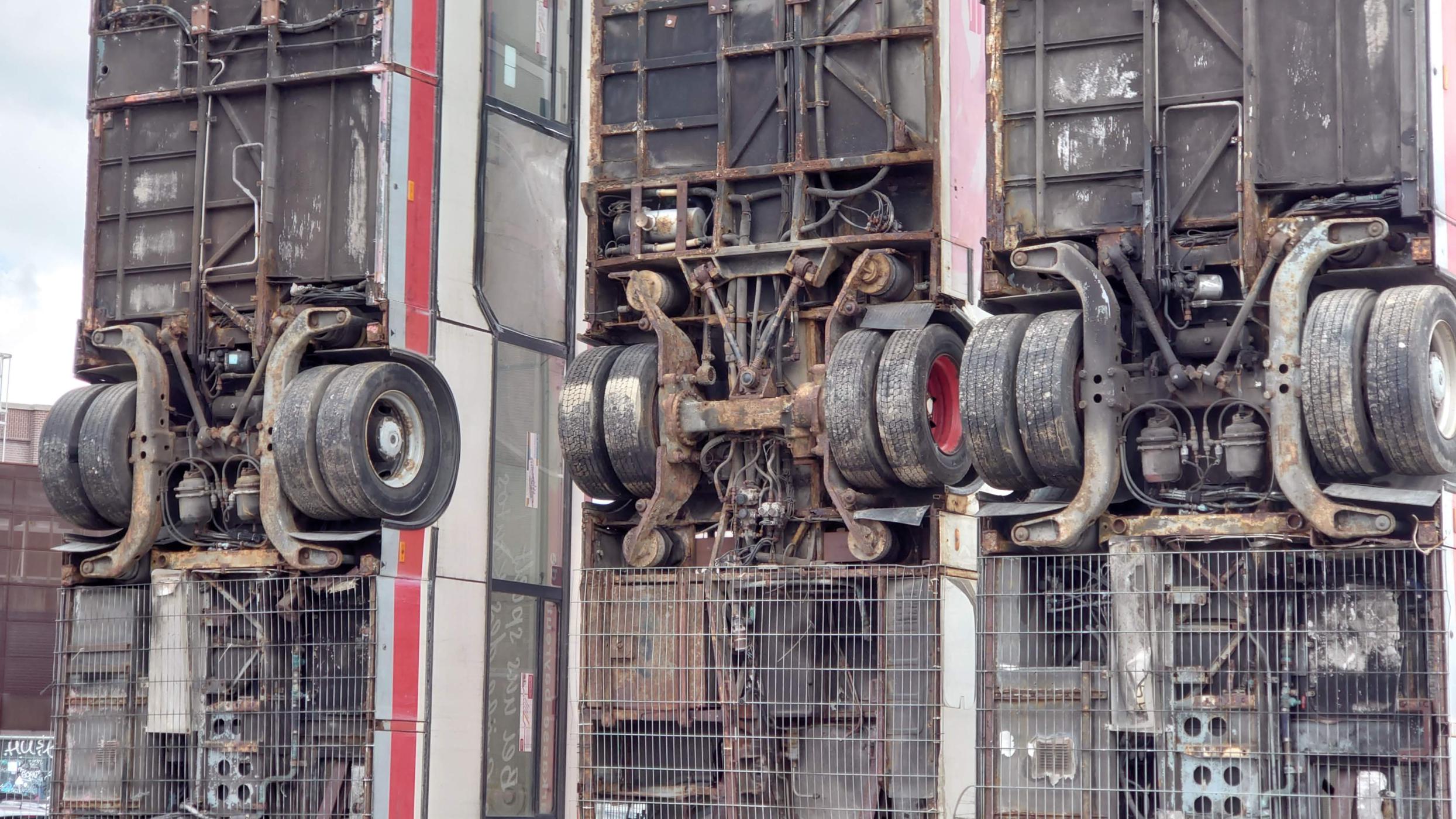 Monument was realised in 2017 by Syrian-German artist Manaf Halbouni. The work originally referred to the war in Syria, where a widespread image in the media showed civilians in a city environment hiding behind three buses. The buses had been put up as one of the many barricades in the city to protect civilians from snipers.