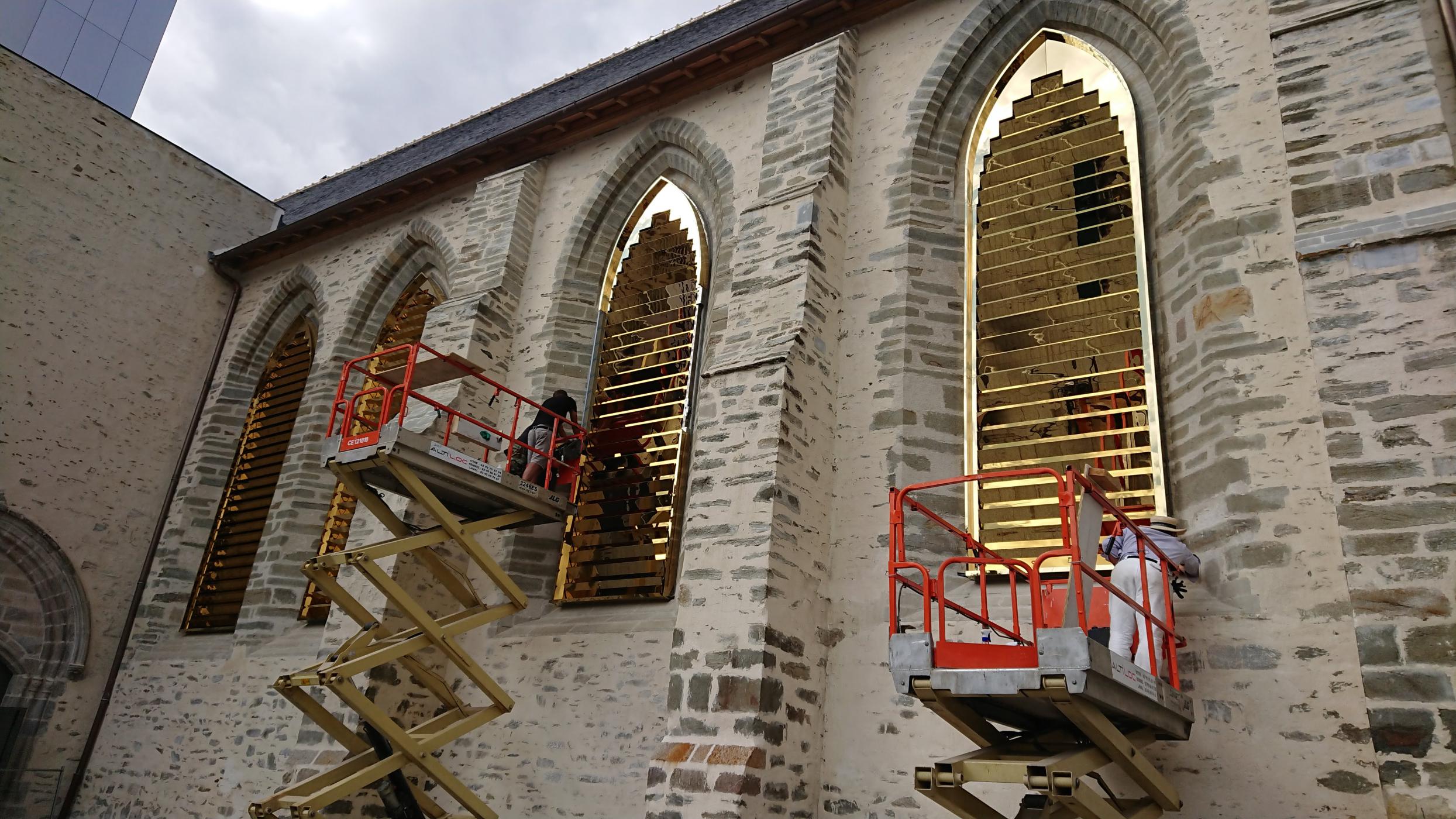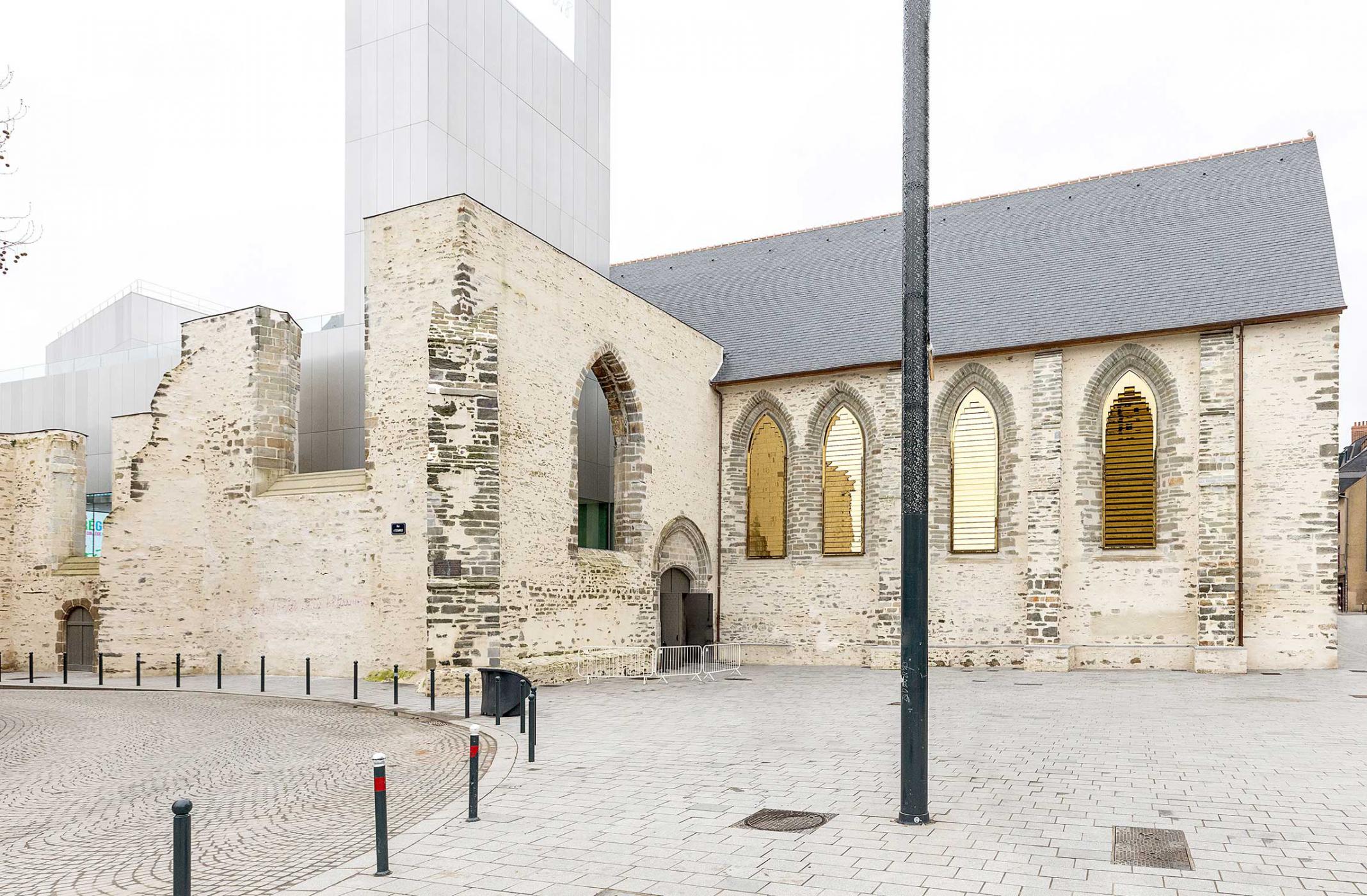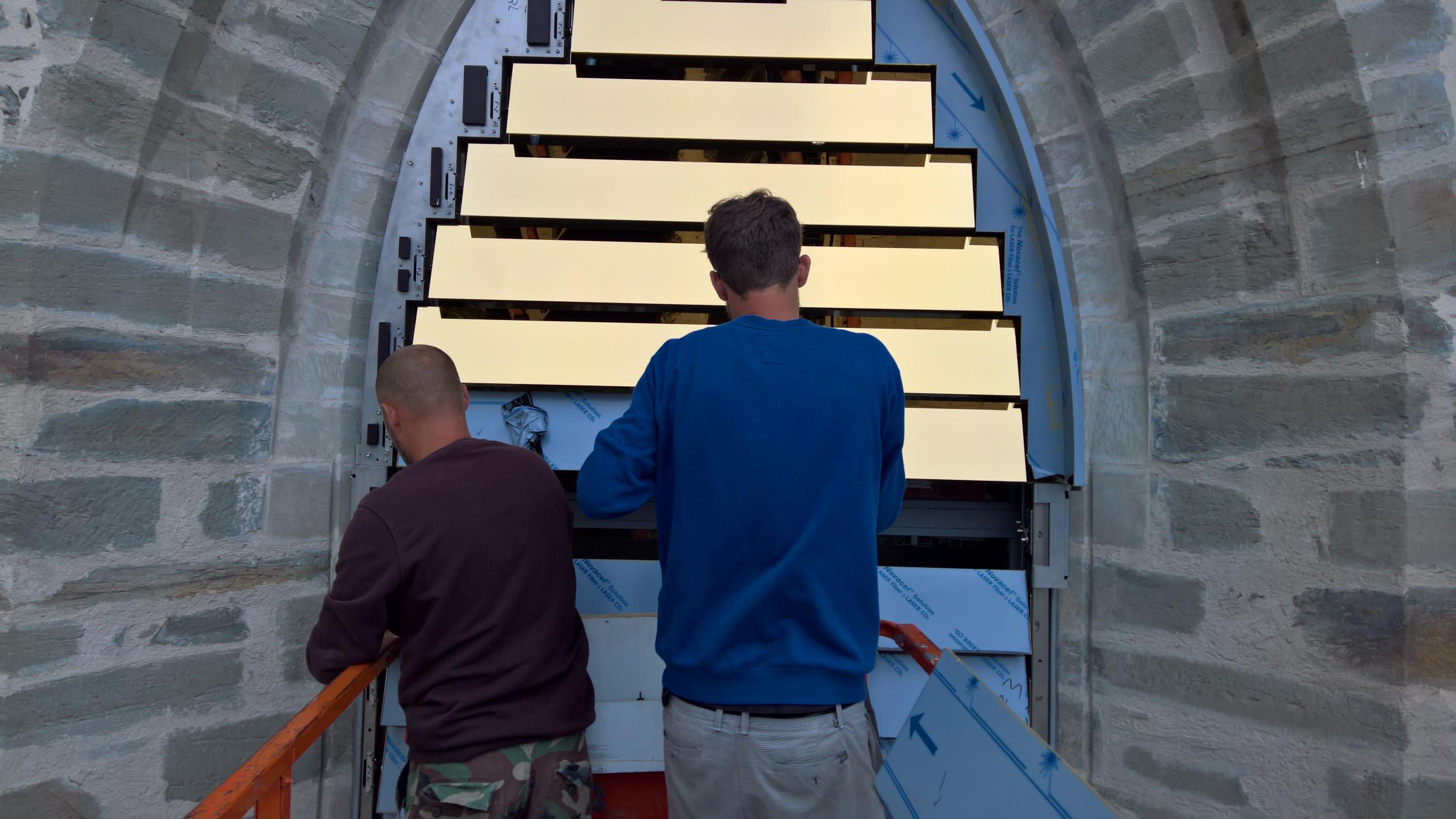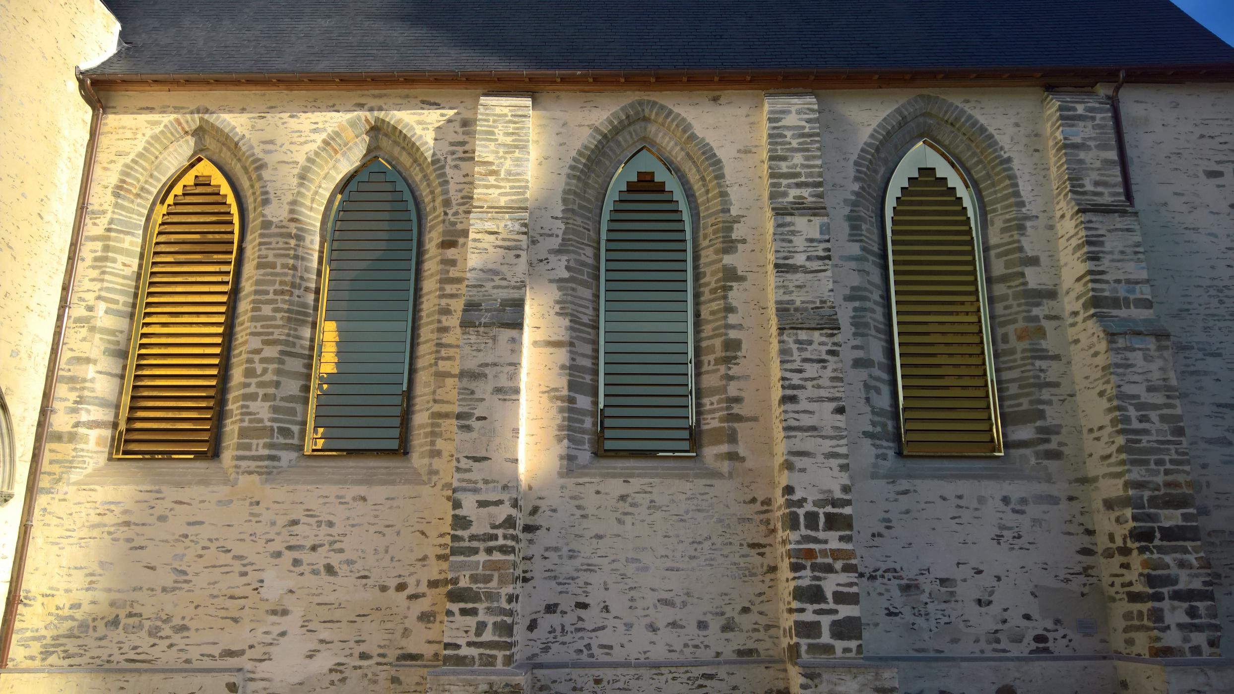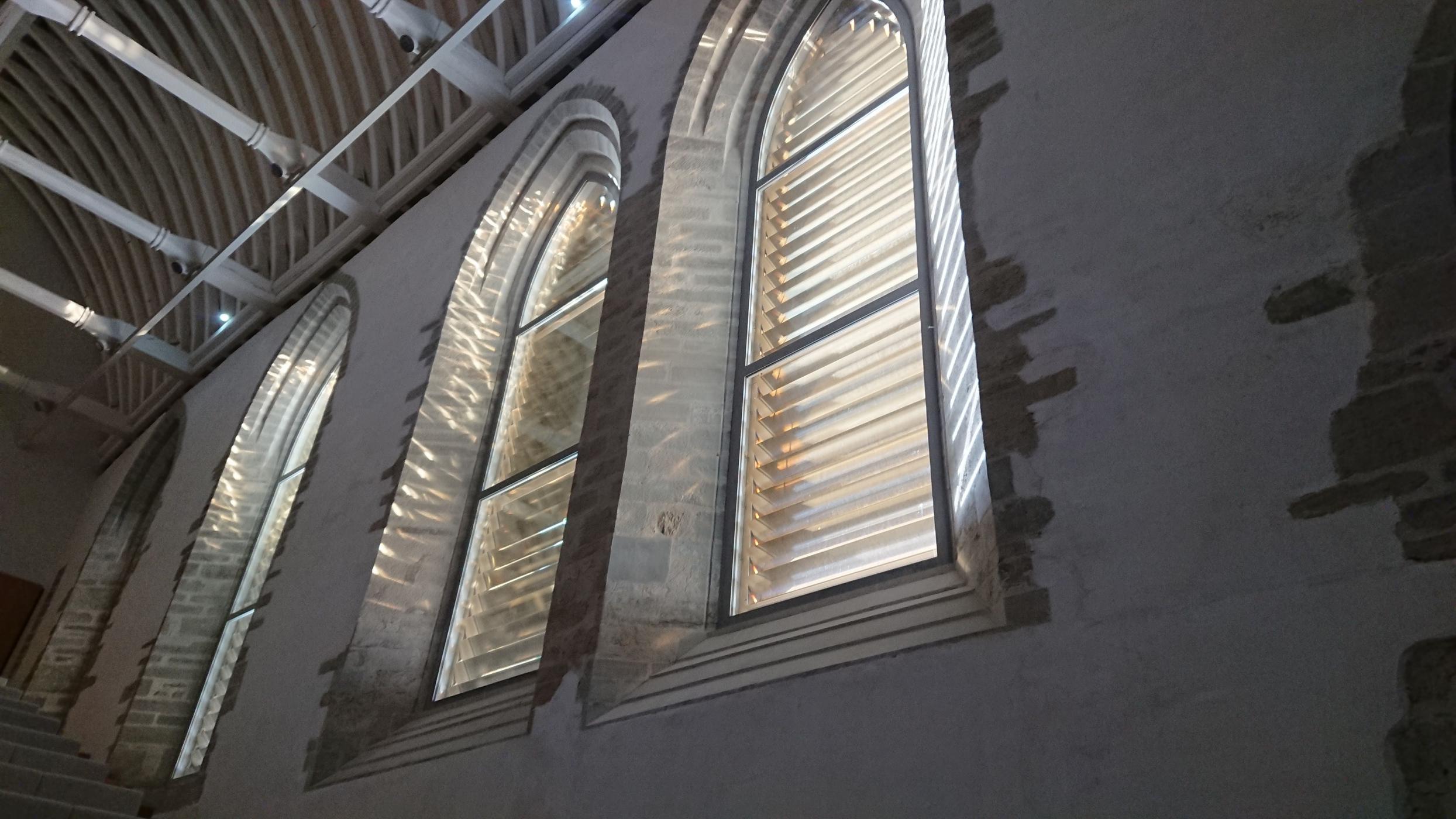 For the Couvent des Jacobins, Laurent Grasso thought of a work that could be installed in the framework of the original bay windows of the convent, integrated into the architecture of the new Congress Center by Jean Guervilly. Each bay window is equipped with brass-plated prism-shaped modules. These modules, integrated into the ribs of the former bay windows, are rotating in a synchronized manner. The movement of the reflecting surfaces produces a feeling of hypnotic strangeness and transforms the bay windows of the former Couvent des Jacobins into screens of mental projections