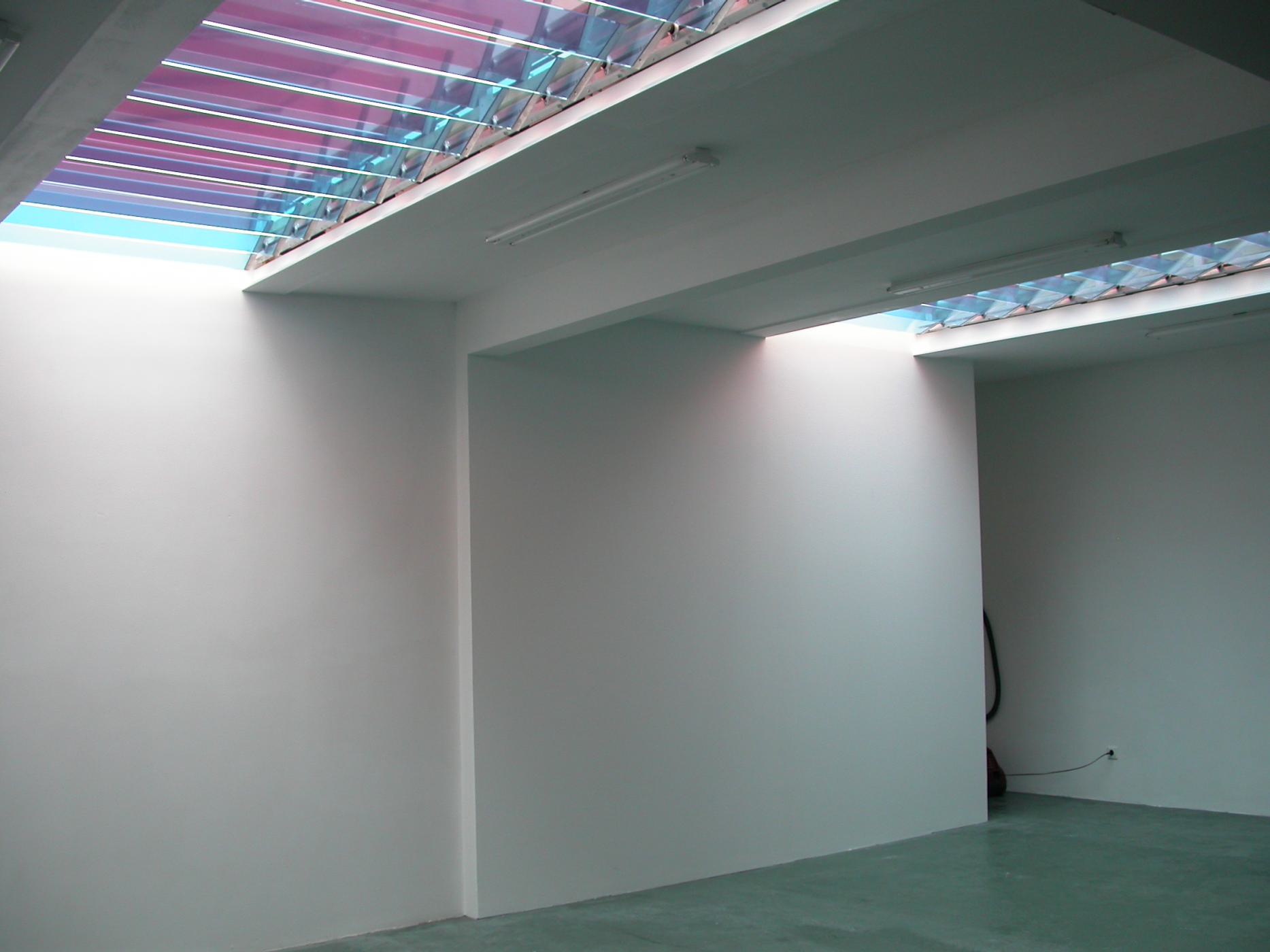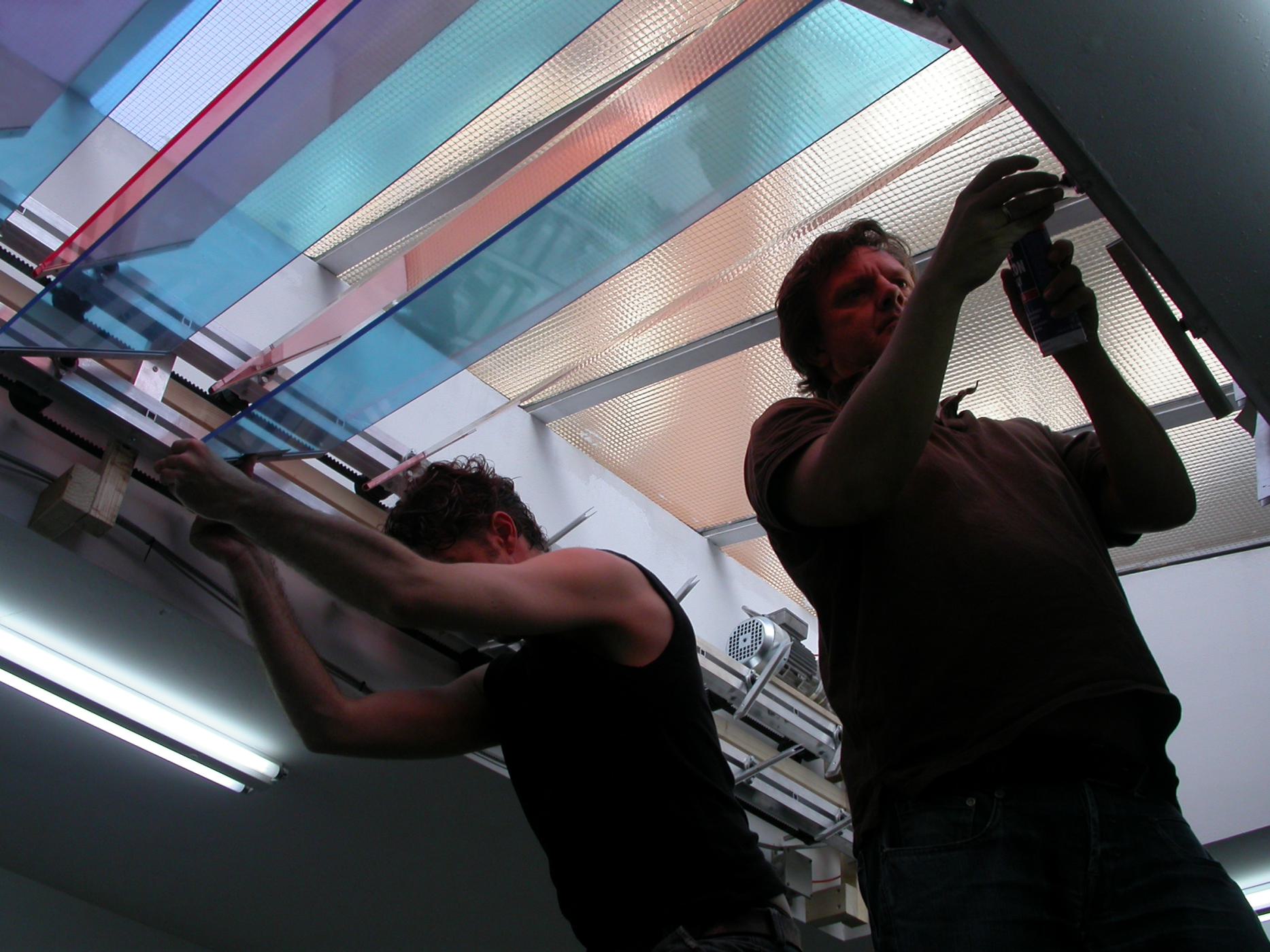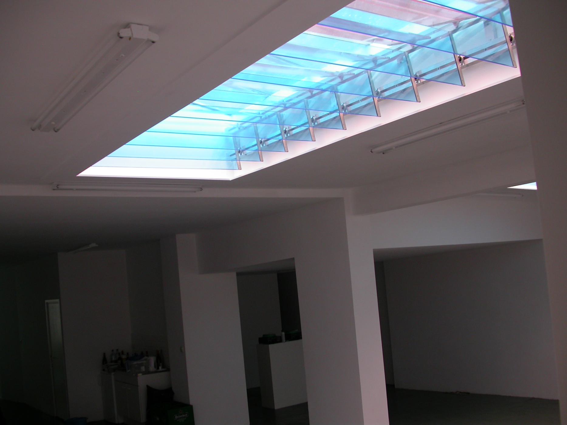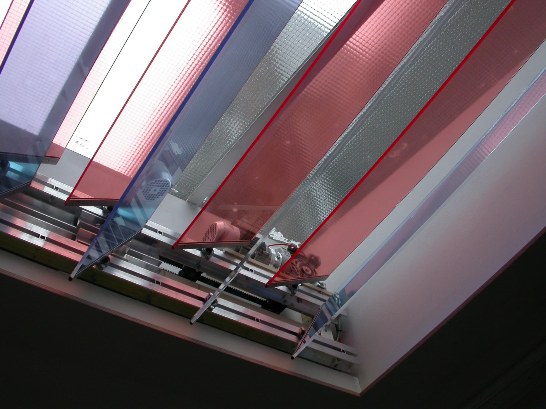 Production and installation of the work "A shimmering of grey" Two skylights with constructed revolving coloured glass plates; blue and orange; simultaneously transform the light causing them to briefly dissolve into one and another and form a shimmering of grey.