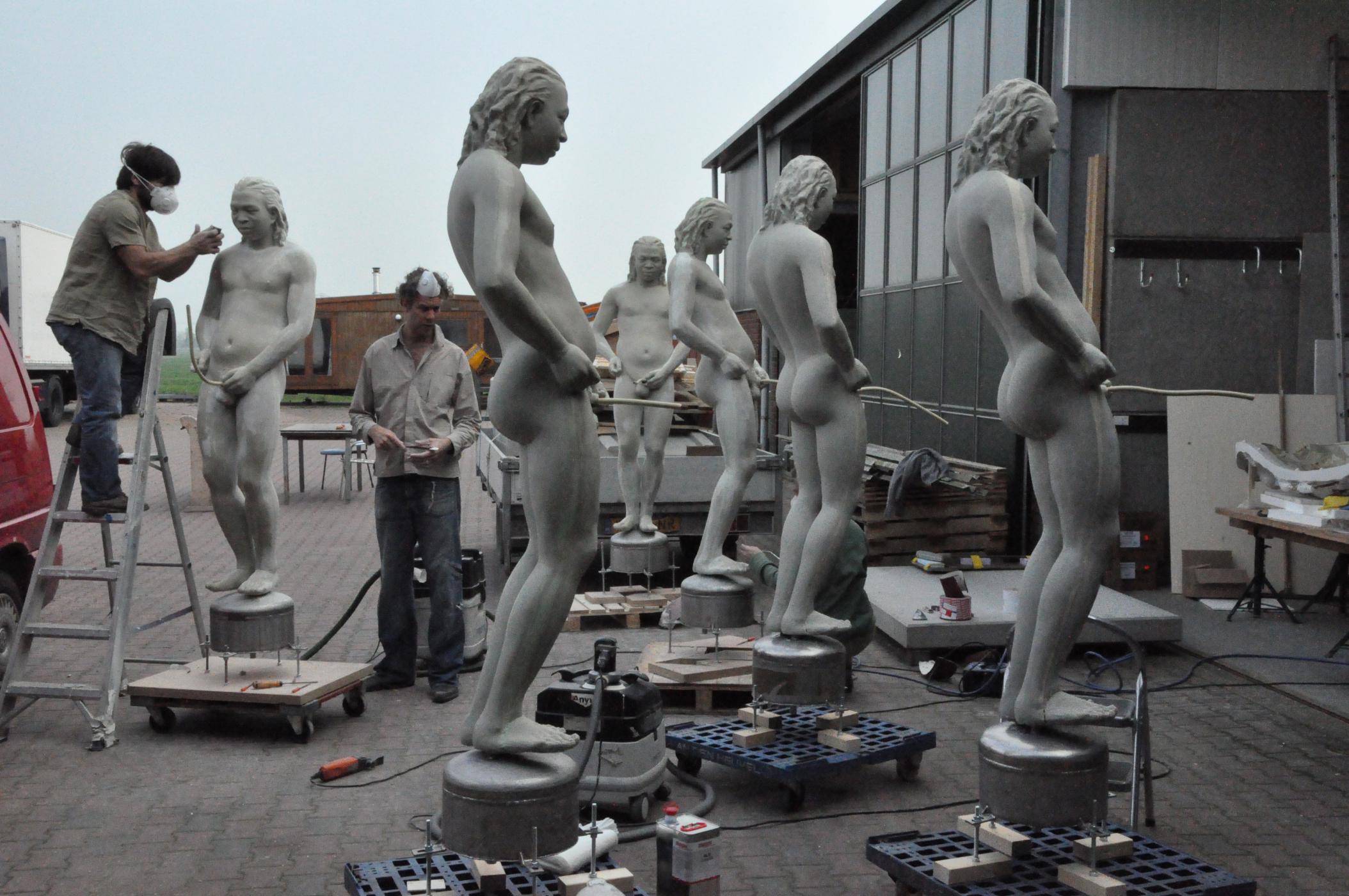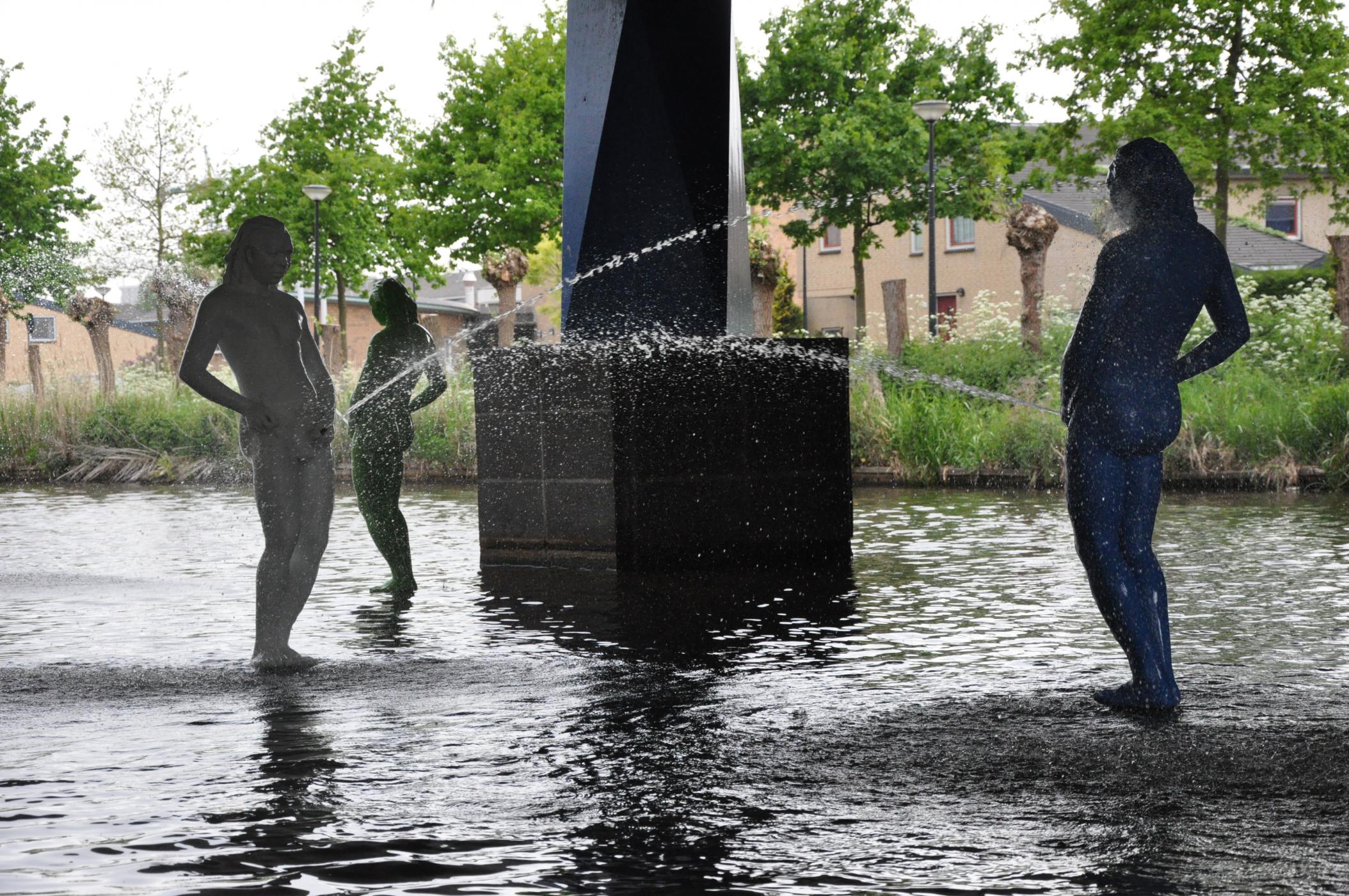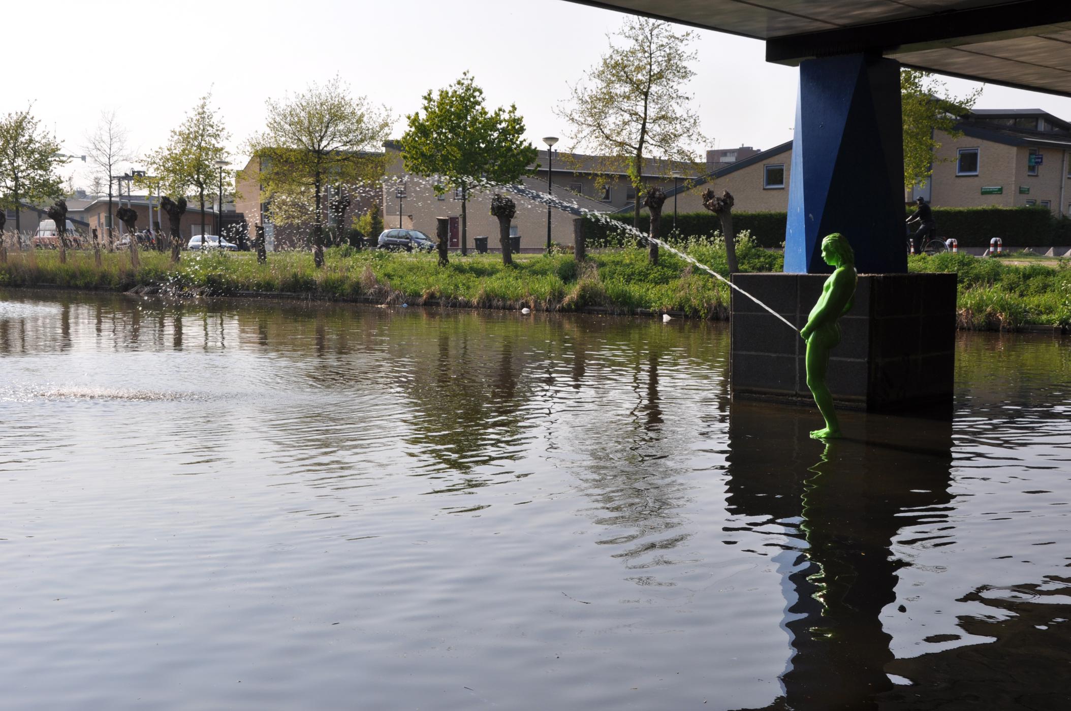 Production and installation of the work "Pisseurs d' Amsterdam". The fountain, underneath the viaduct over the Groesbeekdreef, consists of six life size self portraits (head to toe) of the artist posing as "Manneken Pis". The colours of the "Pisseurs d' Amsterdam" (red, white, blue, green, yellow and black) are based on the flags of Cameroon, The Netherlands and Belgium.